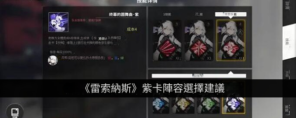 《雷索納斯》紫卡隊陣容選擇建議 在《雷索納斯》中,紫卡隊的陣容選擇至關重要,它能決定你在遊戲中的戰鬥實力。以下是一些針對紫卡隊陣容選擇的建議: 3. **紫卡隊陣容的調整**:根據玩家的個人選擇和戰術需求
