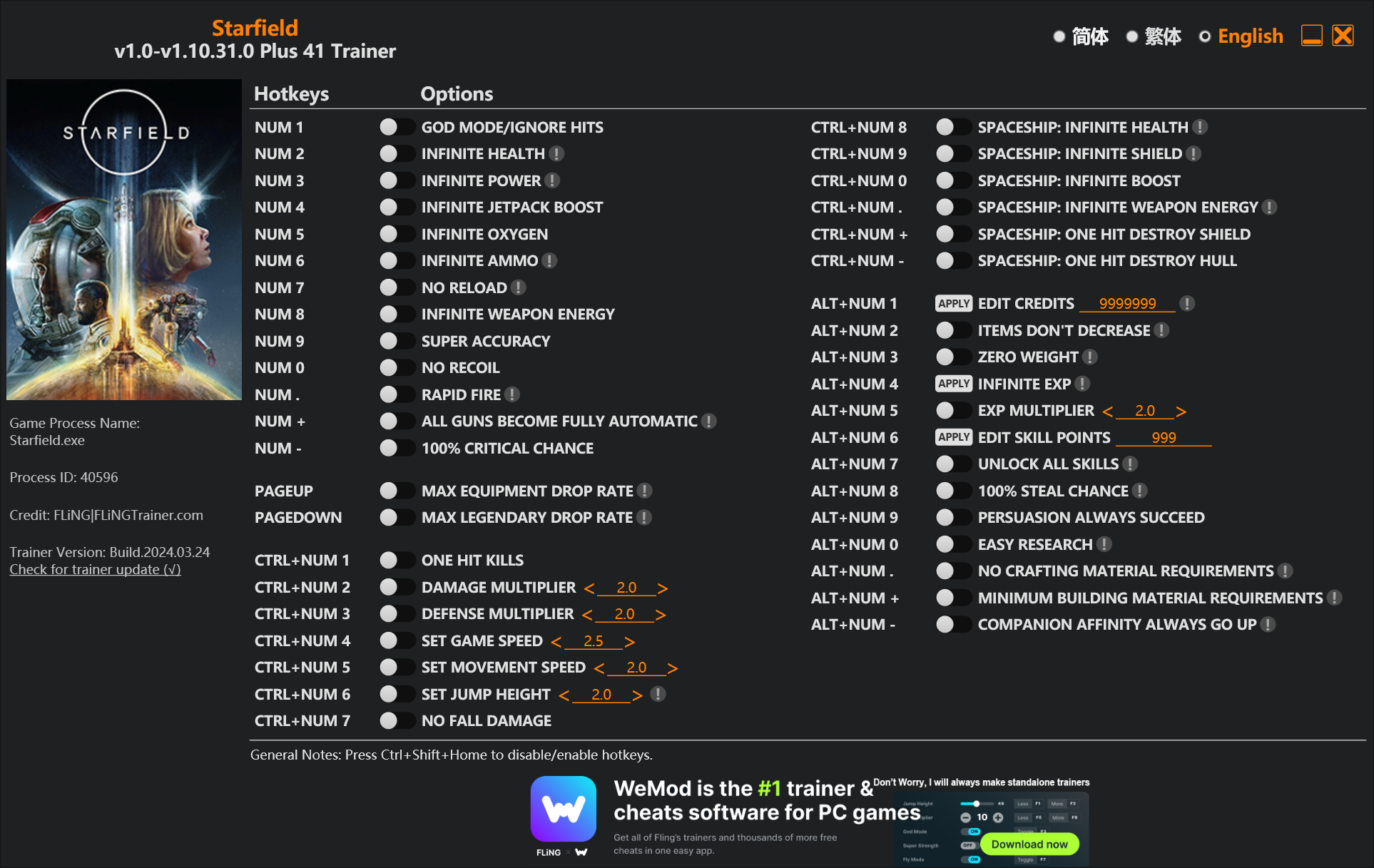 replyreload += ',' + 2342528;41 選項 · 遊戲版本:v1.0-v1.10.31.0+ · 最後更新:2024.03.24 星空訓練師/作弊 選項 數字鍵 1 – 上帝模式/忽略命中 數字鍵 2 – 無限生命值 數字鍵 3 - 無限力量 數字鍵 4 -