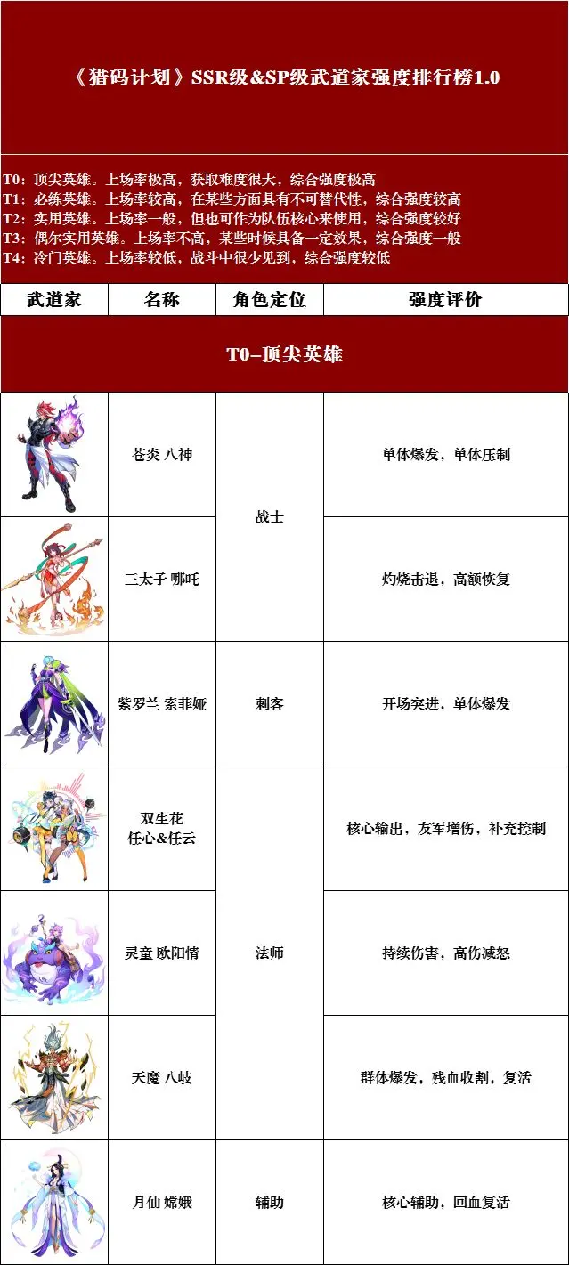 2. **武道家強度排行榜詳解** - **T0:頂尖英雄** - 上場率極高,獲取難度大,綜合強度極高。 3. **注意事項** - **排行榜僅供參考** - **
