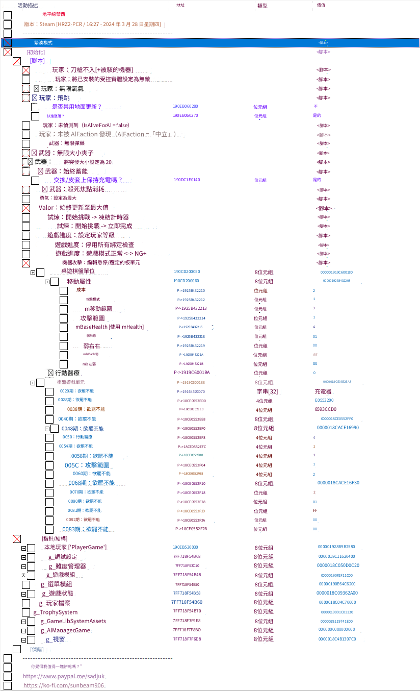 正文摘要:replyreload += ',' + 2343020;遊戲廠商:Steam 遊戲版本:HRZ2-PCR / 16:27 - 2024 年 3 月 28 日星期四 (1.0.43) | [應與 1.0.37 和 1.0.38 相容] 遊戲進程:HorizonForbiddenWest.exe 特點:(您可以在上面的截圖中看到我經常使用的功能) --------------------------------------------------------------------------------------------------------------------- 請注意,整個表格都可以進行高度自定義,因此您可以根據自己的需求和風格進行調整。下面將提供詳細的解釋,請花點時間仔細閱讀。 玩家:無敵 當被擊中時,Aloy通過LocalPlayer->Entity->Destructibility->mInvulnerable屬性設置為0x1變得無敵。同時,您擁有的任何被黑客入侵的機器也會變得無敵。無論您是騎乘還是步行,只要受控實體屬於AIGroup 0x5(HackedMachines),它們就會變得無敵。如果您不喜歡具有免疫力的打擊或元素效果,和/或對您的黑客機器應用相同規則,那麼請在腳本中的第15行和/或第39行上放置//(右鍵單擊腳本>更改腳本)進行注釋。重新加載保存遊戲,然後進行設置。從那時起,您會被擊中,但生命值不會減少(所有其他元素攻擊都會影響您)。 注意:您和您的黑客機器的mInvulnerable布爾值似乎存儲在您的保存遊戲中。如果發生這種情況,即在保存/重新加載後無法禁用它,則: 禁用腳本 進入[指針/結構] 在“LocalPlayer ['PlayerGame']”前面的“-”上單擊(不要勾選複選框!) 在“[0048] Humanoid['Entity']”前面的“-”上單擊(不要勾選複選框!) 在“[00D0] Destructibility”前面的“-”上單擊(不要勾選複選框!) 雙擊“[0070] mInvulnerable”中您看到的1值,並將其設置為0 安裝您的黑客機器 在“[0048] Humanoid['Entity']”樹下的“[0080] Mount['ControlledEntity']”前面的“-”上單擊(不要勾選複選框!) 在“[0080] Mount['ControlledEntity']”樹下的“[00D0] Destructibility”前面的“-”上單擊(不要勾選複選框!) 雙擊“[0070] mInvulnerable”中您看到的1值,並將其設置為0 此後保存遊戲,然後進行設置。 -- 玩家:設置騎乘控制實體的無敵 騎乘時,單擊以運行此腳本,並將您的坐騎的Destructibility->mInvulnerable設置為0x1。如果您希望進行重置,請禁用腳本(禁用不運行任何操作),右鍵單擊腳本>更改腳本,在第19行進行操作,並將其設置為writeBytes(Destructibility + 0x70,0)。騎乘時重新運行腳本。它將禁用您坐騎的無敵。 注意:這不是一個凍結腳本。您只是在啟動/運行腳本時設置屬性。因此,不要讓我聽到您說“我啟用了腳本,但我的坐騎並不保持無敵”。使用上面的腳本來解決此問題。 -- 玩家:無限氧氣 將DebugSettings->mInfiniteOxygen開發人員設置為1。結果:當您潛水時,屏幕中間不再顯示氧氣條,也不會耗盡氧氣。您可以通過點擊g_DebugSettings前面的“-”來檢查所有公開的DebugSettings標誌[指針/結構]。不要勾選複選框!這樣做的效果是凍結一個值,您不想要。 -- 玩家:飛行跳躍 將玩家的HumanoidMover組件的墜落狀態更新鉤住並在觸發此鉤住時執行多個操作: 它將不斷更新mPositionFallingFrom XYZ,其中包含玩家實體的mPosition值 它將不斷更新mLastPositionThatWasTouchingGround XYZ,其中包含玩家實體的mPosition值 這樣做將禁用由墜落造成的傷害。遊戲認為您不斷從當前XYZ位置墜落,因此沒有計時器計算將應用於墜落傷害的時間(保持為0 )。 它將不斷向HumanoidMover的mIsOnGround和mIsSupported屬性寫入1 這使遊戲認為您始終處於地面表面上並且站在支撐玩家的地面上(因此不附著在牆上)。由於這種設置,您可以執行多次跳躍(在再次按Space鍵之前給予1秒的暫停),並且可以控制是否慢慢墜落到地面上。 它將不斷向HumanoidMover的mTimeSinceWeLastTouchedTheGround和mTimeInFallingState屬性寫入0 這將使遊戲認為您從未離開過地面並且未花費時間墜落。 它在特定按鍵按下時應用基於HumanoidMoverResource->mMaxFallSpeed和分除器的值計算的值到HumanoidMover->mVerticalVelocity屬性 一旦您激活腳本,您可以使用T和Y鍵將玩家向上或向下推動。如果您想爬到一座山上,切換到奔跑模式(按住Shift鍵1次或保持按下,取決於您的可訪問性設置),然後按住T鍵上升,然後按住Space鍵展開滑翔傘。一旦您超過想要下落的著陸點,請釋放T鍵。可以在腳本中修改按鍵(右鍵單擊腳本>更改腳本>參見第45行和56行)。 最後,一旦啟用此腳本,您可以使用出現的2個子設置來控制幾個方面: 禁用地面更新? 雙擊“否”,從下拉菜單中選擇“是”。這將跳過地面更新檢查,這意味著mIsOnGround和mIsSupported不再被強制為1。這樣的結果是:玩家不會被檢測為站在地面上,這意味著您現在可以使用滑索(附加到它們)。 快速下落? 雙擊“是”,從下拉菜單中選擇“否”。這將不讓HumanoidMover::Update函數繼續執行,並在應用所有設置後立即退出。其結果是玩家朝地面緩慢下降。多次按Space鍵(每次相隔0.5-1秒)並獲得一些高度。然後觀察Aloy慢慢失去高度。由於此函數快速退出,無法應用速度。這意味著按T鍵將不會將您向上推動。 注意:使用此選項時,如所實現的那樣,而不更改上述兩個設置,將無法附加到滑索,甚至無法使用滑翔翼。為什麼?遊戲認為您在地面上,您沒有足夠的時間按住Space以展開滑翔翼。閱讀以下內容,了解如何仍然實現此目標。 組合和結果(1 =禁用地面更新?; 2 =快速下降?): 1 =否; 2 =是(默認) 無法附加到滑索(附加時立即分離)。只能在較短的距離上使用滑翔翼。要使用它,您需要首先按Space讓Aloy跳躍,然後按住T鍵向上推動,然後按住Space鍵展開滑翔翼。下
