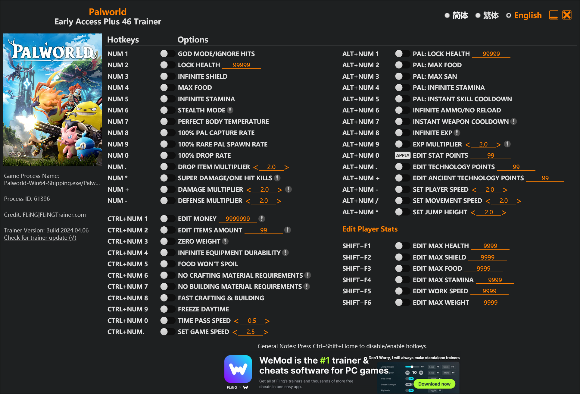 replyreload += ',' + 2343630;46 選項 · 遊戲版本:搶先體驗+ · 最後更新:2024.04.06 注意:僅限單人遊戲模式。 Palworld 訓練家/作弊選項 數字鍵 1 – 上帝模式/忽略命中 數字鍵 2 – 鎖定健康狀況 數字鍵