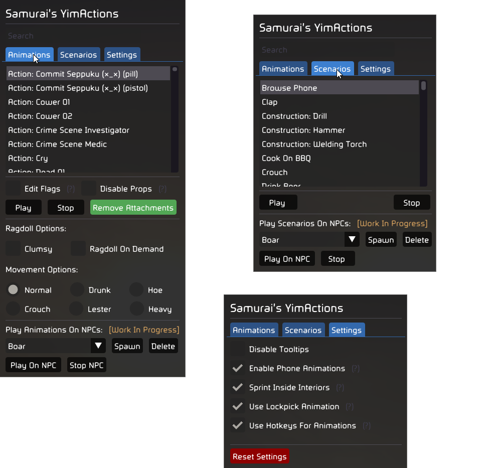 replyreload += ',' + 2343927; - 該腳本的目的是使用其道具/物件和粒子效果(如果需要)播放動畫。 - 目前有202個動畫。 在這個腳本中包含每個 GTA V 動畫都是浪費時間,因為 YimMenu 已經有一個流暢的內建動畫