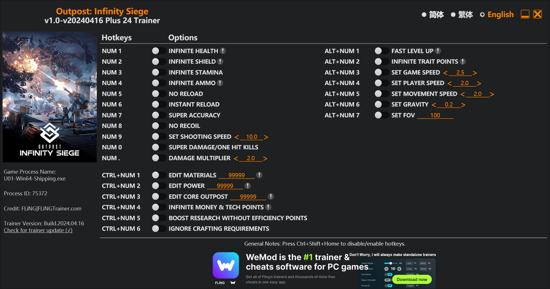 replyreload += ',' + 2344444;24選項 · 遊戲版本:v1.0-v20240416+ · 最後更新:2024.04.16 前哨站:無限攻城訓練師/作弊選項 數字 1 – 無限生命值 數字鍵 2 - 無限護盾 數字鍵 3 - 無限耐力 數字鍵 4 - 無限