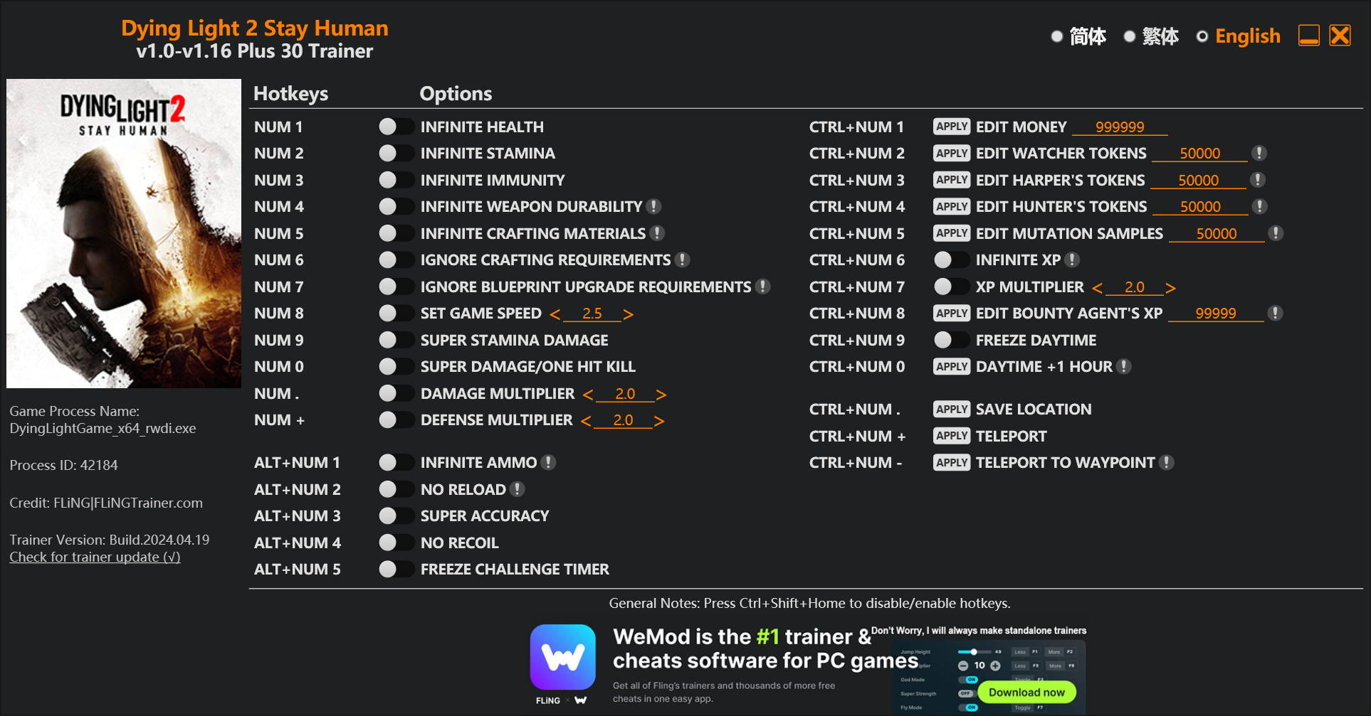 replyreload += ',' + 2344448;30個選項 · 遊戲版本:v1.0-v1.16+ · 最後更新:2024.04.19 《消逝的光芒 2》保持人類訓練師/作弊選項 數字 1 – 無限生命值 數字鍵 2 - 無限耐力 數字鍵 3 - 無限免疫 數字鍵 4