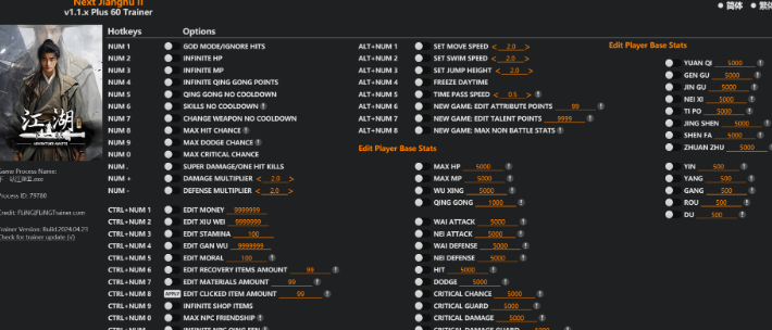 replyreload += ',' + 2344949;60 選項 · 遊戲版本:v1.1.x+ · 最後更新:2024.04.23 數字鍵 1 – 上帝模式/忽略命中 數字鍵 2 - 無限 HP 數字鍵 3 - 無限 MP 數字鍵 4 - 無限輕功點 數字鍵 5 - 輕功無冷卻 數