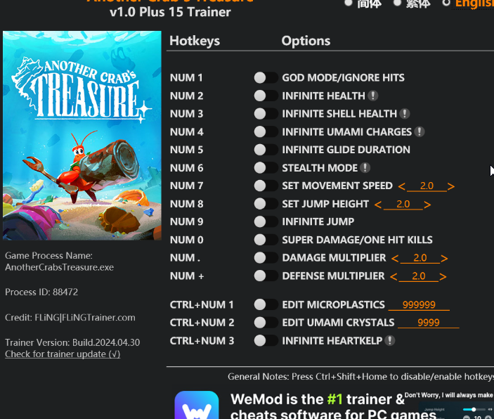 replyreload += ',' + 2345443; 15個選項 · 遊戲版本:v1.0+ · 最後更新:2024.04.30 另一種螃蟹的寶藏訓練師/作弊選項 數字鍵 1 – 上帝模式/忽略命中 數字鍵 2 – 無限生命值 數字鍵 3 - 無限外殼生命值 數