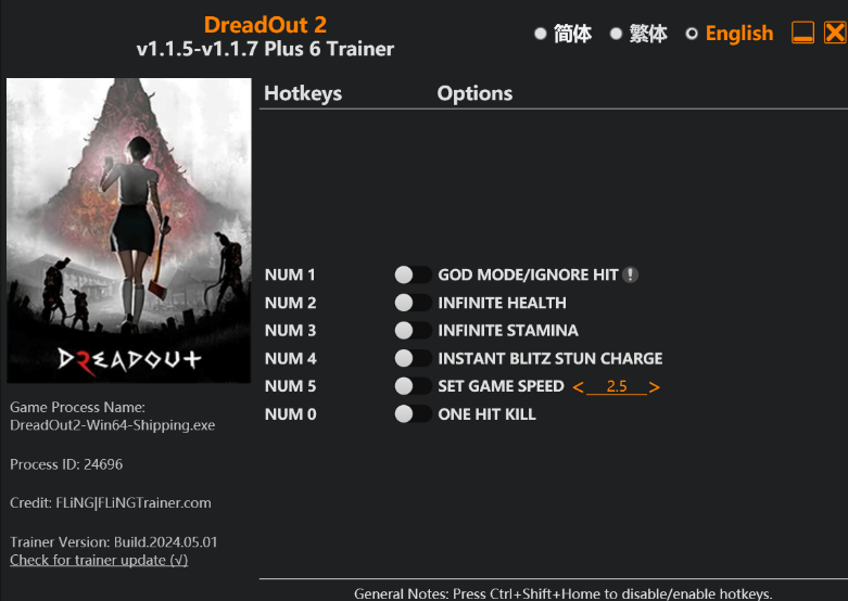 replyreload += ',' + 2345444;6個選項·遊戲版本:v1.1.5-v1.1.7+·最後更新:2024.05.01 DreadOut 2 訓練師/作弊選項 數字鍵 1 – 上帝模式/忽略命中 數字鍵 2 – 無限生命值 數字鍵 3 - 無限耐力 數字鍵 4