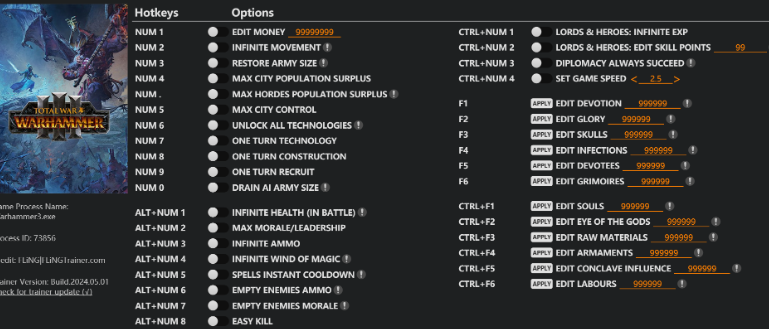 replyreload += ',' + 2345446; 37選項 · 遊戲版本:v1.0-v5.3.0+ · 最後更新:2024.11.8 全面戰爭:戰鎚 III 訓練家/作弊選項 數字 1 – 編輯金錢 數字鍵 2 – 無限移動 數字鍵 3 - 恢復軍隊規模 數字鍵 4 -