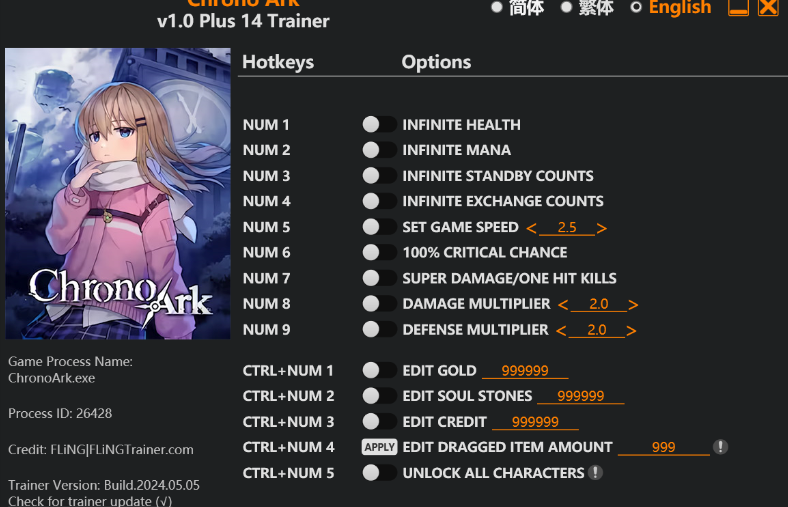 replyreload += ',' + 2345783; 14個選項·遊戲版本:v1.0+·最後更新:2024.05.05 時空方舟訓練家/作弊選項 數字 1 – 無限生命值 數字鍵 2 - 無限法力 數字鍵 3 – 無限待機次數 數字鍵 4 – 無限兌換次數 數