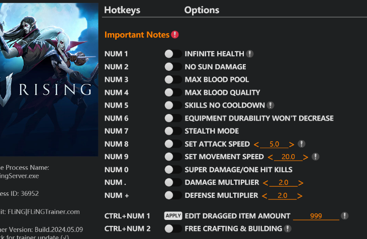 replyreload += ',' + 2346149;14個選項 · 遊戲版本:v1.0+ · 最後更新:2024.05.09 V Rising 訓練家/作弊選項 數字 1 – 無限生命值 數字鍵 2 – 無陽光傷害 數字鍵 3 - 最大血池 數字鍵 4 - 最高血液質量 數