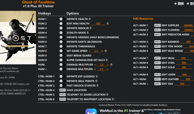 replyreload += ',' + 2346659; 30個選項 · 遊戲版本:v1.0+ · 最後更新:2024.05.17 對馬島靈魂訓練/作弊 選項 數字 1 – 無限生命值 數字鍵 2 - 編輯最大生命值 數字鍵 3 - 無限決心 數字鍵 4 - 隱身模式 數