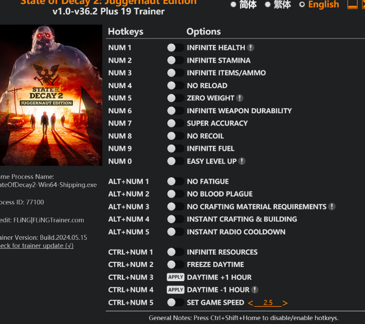 replyreload += ',' + 2346712; 19 個選項 · 遊戲版本:v1.0-v36.2+ · 最後更新:2024.05.15State of Decay 2: Juggernaut Edition 訓練師/作弊器 選項 數字 1 – 無限生命值 數字鍵 2 - 無限耐力 數字鍵 3 –