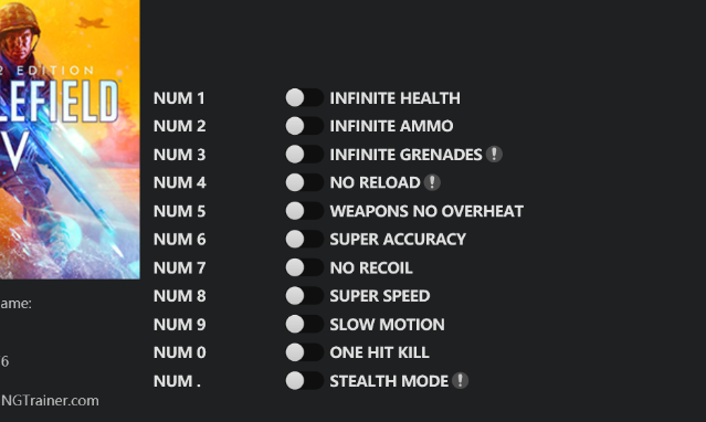 replyreload += ',' + 2346717; 11個選項·遊戲版本:v1.0-v4991425+·最後更新:2024.05.14 注意:僅限故事模式。 戰地 V 訓練器/作弊選項 數字 1 – 無限生命值 數字鍵 2 - 無限彈藥 數字鍵 3 - 無限手榴彈