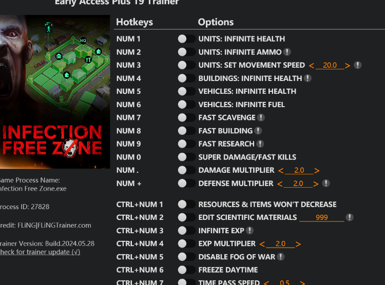 replyreload += ',' + 2347613;19 個選項 · 遊戲版本:搶先體驗+ · 最後更新:2024.05.28 無感染區訓練家/作弊選項 數字 1 - 單位:無限生命值 數字鍵 2 - 單位:無限彈藥 數字鍵 3 - 單位:設定移動速度 數字