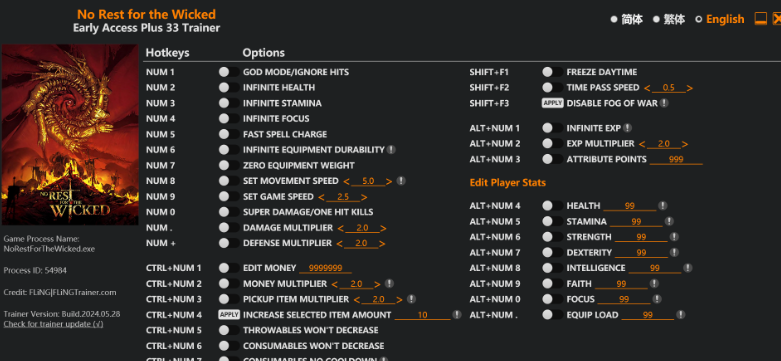replyreload += ',' + 2347614;33 選項 · 遊戲版本:搶先體驗+ · 最後更新:2024.05.28 邪惡的訓練家沒有休息/作弊選項 數字鍵 1 – 上帝模式/忽略命中 數字鍵 2 – 無限生命值 數字鍵 3 - 無限耐力 數字鍵 4 -