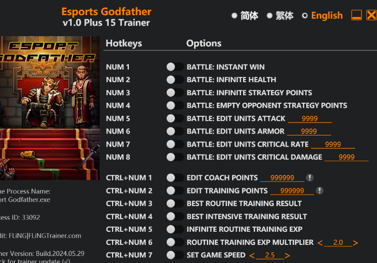 replyreload += ',' + 2347616; 15個選項 · 遊戲版本:v1.0+ · 最後更新:2024.05.29 電競教父訓練家/作弊OPTIONS Num 1 - 戰鬥:即時勝利 數字鍵 2 - 戰鬥:無限生命值 數字鍵 3 - 戰鬥:無限策略點 數字鍵 4