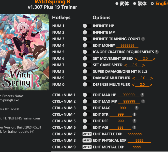 replyreload += ',' + 2347860; 19個選項 · 遊戲版本:v1.307+ · 最後更新:2024.05.31 WitchSpring R 訓練器/作弊選項 數字鍵 1 - 無限 HP 數字鍵 2 - 無限 MP 數字鍵 3 – 無限訓練次數 數字鍵 4 – 編輯