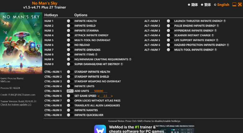 replyreload += ',' + 2347861;27 選項 · 遊戲版本:v1.5-v4.71+ · 最後更新:2024.05.31《無人深空》訓練/作弊 選項 數字 1 – 無限生命值 數字鍵 2 - 無限護盾 數字鍵 3 - 無限耐力 數字鍵 4 - 噴射背包無限