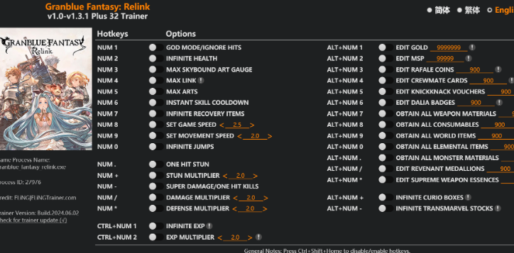 replyreload += ',' + 2348063;32個選項·遊戲版本:v1.0-v1.3.1+·最後更新:2024.06.02 碧藍幻想:重新連結訓練器/作弊選項 數字鍵 1 – 上帝模式/忽略命中 數字鍵 2 – 無限生命值 數字鍵 3 - 最大天空藝術量