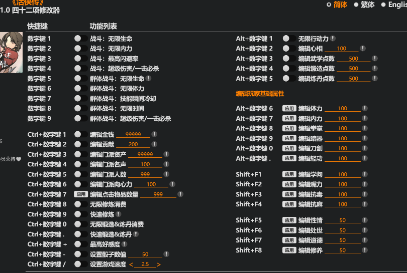 replyreload += ',' + 2349253; 《活俠傳(Legend of Mortal)》v1.0 版本迎來了風靈月影推出的四十二項全能修改器,為玩家帶來更豐富的遊戲體驗。這款修改器提供了多項功能,讓玩家能夠自由調整遊戲中的各種屬
