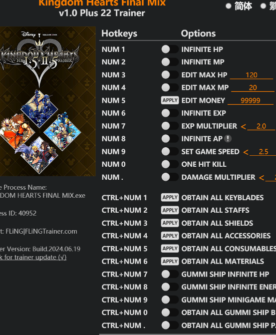 replyreload += ',' + 2349542; 22 個選項 · 遊戲版本:v1.0+ · 最後更新:2024.06.19王國之心 Final Mix 選項 數字鍵 1 - 無限 HP 數字鍵 2 - 無限 MP 數字鍵 3 - 編輯最大生命值 數字鍵 4 - 編輯