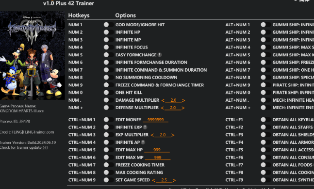 replyreload += ',' + 2349548; 42 個選項 · 遊戲版本:v1.0+ · 最後更新:2024.06.19王國之心 III 訓練師/秘籍 選項 數字鍵 1 – 上帝模式/忽略命中 數字鍵 2 - 無限 HP 數字鍵 3 - 無限 MP 數字鍵 4 - 無限
