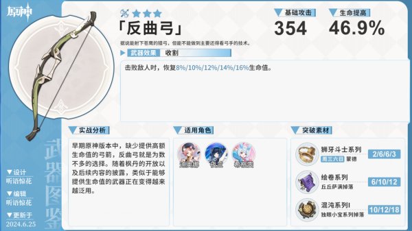 五星武器白雨心弦超高生命副詞的弓,基本該武器獨特的主屬性目前也適合奶媽輔助使用。武器庇護效果進一步提升生命屬性,可以理解為進一步提升保護和治療能力。由於吃滿需要生命之契,使用目前常規情況下應該只有希格