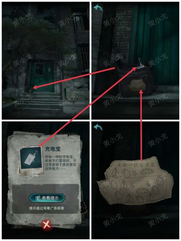 第一章上1.(筒子樓外)點擊門外的背包,獲得【充電寶】,查看背包上的貼紙