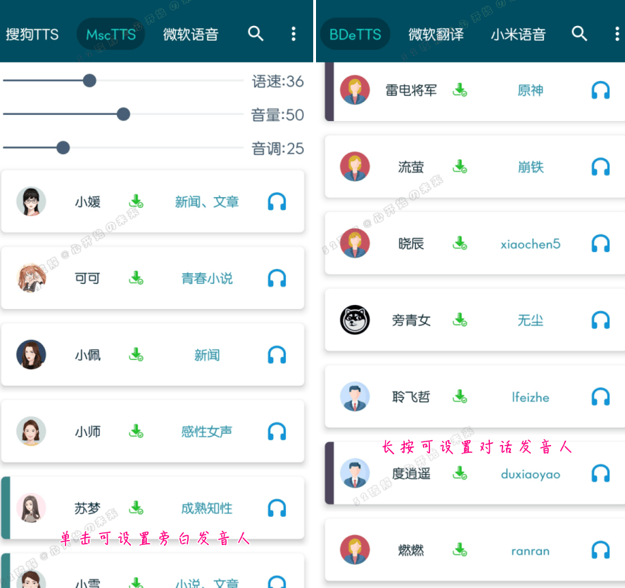 正文摘要:《MultiTTS 1.5.3.1》Android離線文字轉語音工具 - 聽書專用 海量AI語音包免費下載 軟體介紹 MultiTTS是一款免費可離線的文字轉語音工具,專為其他閱讀軟體提供豐富多樣的AI語音包,實現多音色的無障礙朗讀功能,大幅提升離線聽書體驗。它彌補了手機系統自帶單一乏味且生硬的TTS語音引擎的不足。 軟體特色 1. 可自行編輯、添加、刪除、排序和導出語音包引擎數據 2. 合成語音時可選擇本地音樂作為背景音樂 3. 支持多種人物角色規則,可指定發音人朗讀 4. 支持多家大廠離線語音及在線翻譯發聲引擎 5. 可自定義導出DIY語音包 使用說明 1. 下載並安裝MultiTTS 2. 導入語音包zip文件 3. 設置MultiTTS為首選TTS引擎 4. 給予必要權限以提高穩定性 5. 搭配閱讀軟體如"閱讀3.0"使用 畫面演示: Q2: 為何頻繁提示"未設置對話/旁白發音人"? A2: 請檢查"合成對話"開關設置,並正確設置旁白和對話發音人。 Q3: 朗讀為何出現停頓或中斷? A3: 請檢查文本內容、網絡連接狀態,並確保給予軟體必要的權限,如喚醒鎖、後台白名單和更改省電策略等。 👉 GM後台版 遊戲 推薦 ⬇️⬇️⬇️ 快速玩各種二次元動漫手遊app |