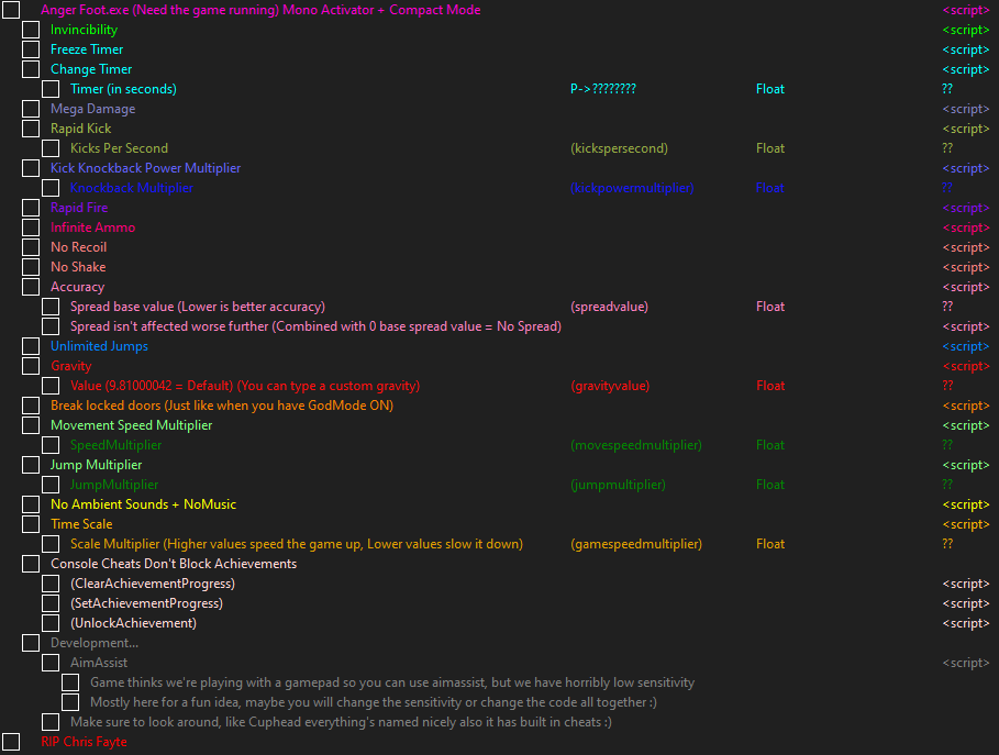 正文摘要:replyreload += ',' + 2352212;《憤怒腿》遊戲免費增強器:極速射擊體驗全面升級! ☑️ 《憤怒腿》遊戲簡介 《憤怒腿》是一款極速第一人稱射擊動作遊戲,結合了激烈的節奏和無影腳般的快速動作。這款遊戲以其獨特的遊戲風格和節奏感十足的音樂,為玩家帶來了一場刺激的射擊體驗。 ☑️ 遊戲增強器介紹 為了讓玩家能夠更好地體驗《憤怒腿》的樂趣,我們為大家帶來了這款功能豐富的遊戲增強器。本增強器適用於Steam平台1.3版本的《憤怒腿》遊戲。 ☑️ 增強器主要功能 1. 無敵模式 2. 時間凍結 3. 時間調整 4. 超級傷害(100倍) 5. 快速踢擊 6. 每秒踢擊次數調整 7. 踢擊後座力倍數調整 8. 擊退力倍數調整 9. 快速射擊 10. 無限彈藥 11. 無後座力 12. 無晃動 13. 彈道散布基礎值調整(數值越低,準確度越高) 14. 彈道散布不受距離影響(結合0基礎散布值可實現無散布) 15. 無限跳躍 16. 重力調整 17. 可破壞鎖定門 18. 移動速度倍數調整 19. 跳躍高度倍數調整 20. 關閉環境音效和音樂 21. 時間尺度倍數調整 22. 使用控制台指令不會阻擋成就解鎖 ☑️ 使用說明 1. 首先,請確保您的電腦上已安裝Cheat Engine 6.5或更新版本。 Cheat Engine (CE修改器) 7.5 漢化版 中文版 https://www.game735.com/thread-377613-1-1.html 2. 下載並解壓縮增強器文件。 3. 運行Cheat Engine,並選擇《憤怒腿》遊戲進程。 4. 載入下載的CT文件。 5. 根據需要啟用或調整相應功能。 ☑️ 注意事項 - 使用增強器可能會影響遊戲平衡,建議僅在單人模式下使用。 - 部分功能可能會影響遊戲體驗,請根據個人喜好謹慎使用。 - 使用增強器可能會導致遊戲成就無法正常解鎖,請注意。 ☑️ 下載連結 所有站內附件皆會附上安全掃描報告請會員查看純淨度百分比後判斷使用(adsbygoogle = window.adsbygoogle || []).push({});相關檔案須知:取得檔案前,請先詳細閱讀文章內容避免不必要錯誤與誤會發生。也可多參考文章討論樓層內容了解附件檔案相關討論資訊。 【此文章部分內容隱藏中】 解除隱藏說明教學點擊下方 繼續閱讀文章 後請仔細觀看文章內容 並依照指示進行下一步最後完成解除隱藏後系統會回到此文章自動顯示隱藏內容~繼續閱讀 ☑️ 常見問題 Q1: 使用這個增強器會被遊戲官方發現嗎? A1: 本增強器僅修改本地遊戲數據,不涉及線上對戰,但仍建議謹慎使用,以免影響遊戲體驗。 Q2: 為什麼我無法使用某些功能? A2: 請確保您使用的是Cheat Engine 6.5或更新版本,並且已正確載入CT文件。某些功能可能需要特定的遊戲場景才能生效。 Q3: 使用增強器後,我的遊戲變得不穩定,該怎麼辦? A3: 建議先關閉所有增強功能,然後逐個啟用測試,以找出導致問題的具體功能。如問題持續,可以嘗試重新安裝遊戲或增強器。 Q4: 這個增強器會定期更新嗎? A4: 目前暫無更新計劃,但我們會關注遊戲版本變化,如有必要會提供更新版本。 Q5: 我可以在多人遊戲中使用這個增強器嗎? A5: 強烈建議僅在單人模式下使用本增強器,以確保公平的多人遊戲環境。 👉 GM後台版 遊戲 推薦 ⬇️⬇️⬇️ 快速玩各種二次元動漫手遊appreplyreload += ',' + 2352212; |