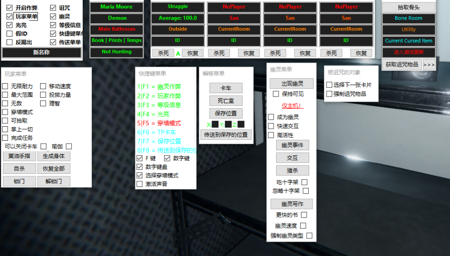 replyreload += ',' + 2352505; 新名稱-修改玩家名字 無限耐力 移動速度修改 最大範圍 投擲力量 無敵 理智值修改 穿牆模式 等級資訊(顯示幽靈資訊 和 玩家資訊) 幽靈資訊(幽靈名稱、幽靈類型、幽靈當前位置、
