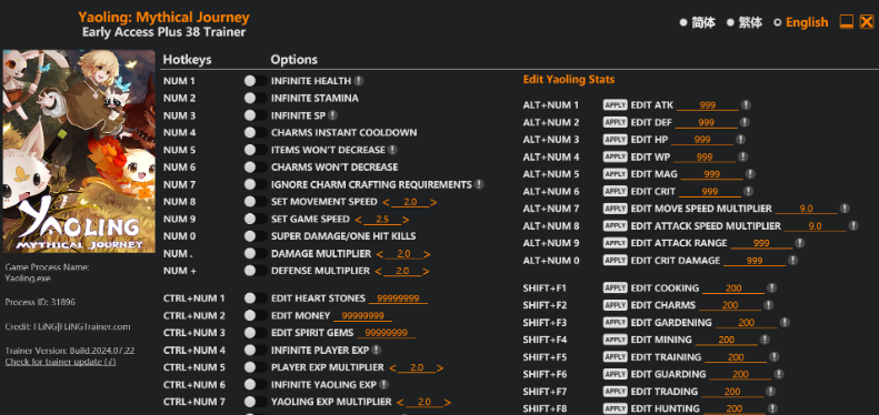 replyreload += ',' + 2352855; 38 選項 · 遊戲版本:搶先體驗+ · 最後更新:2024.07.22 妖靈:神話之旅訓練師/CheatOPTIONS 數字 1 – 無限生命值 數字鍵 2 - 無限耐力 數字鍵 3 - 無限 SP 數字鍵 4 - 魅力瞬