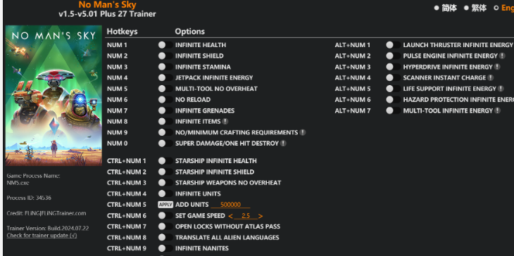 replyreload += ',' + 2352856; 27 選項 · 遊戲版本:v1.5-v5.01+ · 最後更新:2024.07.22《無人深空》訓練/作弊 選項 數字 1 – 無限生命值 數字鍵 2 - 無限護盾 數字鍵 3 - 無限耐力 數字鍵 4 - 噴射背包無