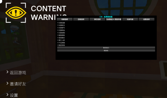 replyreload += ',' + 2354028; v1.0.5更新內容:增加自訂菜單字型大小、增加自訂透視字型大小 [玩家選項] 無限血量 無限耐力 無限氧氣 無限電池 無限錄製 超級跳躍 夜視模式 第三人稱 不會摔倒 隔空取物 復活自