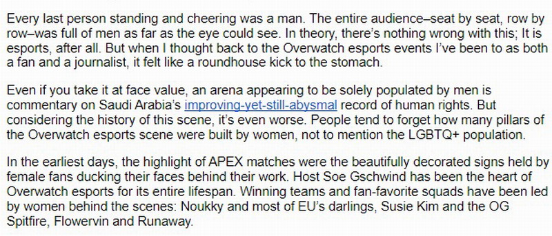 正文摘要:《鬥陣特攻》世界盃賽場缺乏女性觀眾?電競記者言論引發熱議 近日,一位電子競技女記者Liz Richardson在社群平台上發表了對於在沙特阿拉伯舉辦的電競世界盃《鬥陣特攻》比賽的看法,引發了廣泛討論。Richardson表示,她在觀看ZETA DIVISION對戰Toronto Ultra的比賽時,注意到現場觀眾席似乎只有男性,這讓她感到失望,認為缺乏多樣性。 這場討論引發了人們對電競產業多樣性的關注。儘管《鬥陣特攻》在遊戲設計上注重角色的多元性,但在現實世界的競技場上,觀眾群體的組成仍然是一個值得探討的話題。 以下廣告滑動後還有帖子內容var custom_call_MIR = function (params) {if ( params === null || params.hasAd === false ) {var divRowSide;for (let index = 0; index < ONEADs.length; index++) {if (ONEADs[index].pub.player_mode === "mobile-inread") {divRowSide = ONEADs[index].pub.slotobj;}}var ins = document.createElement('ins');ins.className = 'clickforceads';ins.setAttribute('style', 'display:inline-block;');ins.setAttribute('data-ad-zone', '18264');divRowSide.appendChild(ins);var js = document.createElement('script');js.async = true;js.type = 'text/javascript';js.setAttribute('src', '//cdn.holmesmind.com/js/init.js');js.onload = function(){console.log('[ONEAD MIR] ClickForce Loaded');};divRowSide.appendChild(js);}};var _ONEAD = {};_ONEAD.pub = {};_ONEAD.pub.slotobj = document.getElementById("oneadMIRDFPTag");_ONEAD.pub.slots = ["div-onead-ad"];_ONEAD.pub.uid = "1000509";_ONEAD.pub.external_url = "https://onead.onevision.com.tw/";_ONEAD.pub.scopes = ["spotbuy", "speed"];_ONEAD.pub.player_mode_div = "div-onead-ad";_ONEAD.pub.player_mode = "mobile-inread";_ONEAD.pub.queryAdCallback = custom_call_MIR;var ONEAD_pubs = ONEAD_pubs || [];ONEAD_pubs.push(_ONEAD);var truvidScript = document.createElement('script'); truvidScript.async = true; truvidScript.setAttribute('data-cfasync','false'); truvidScript.type = 'text/javascript'; truvidScript.src = '//stg.truvidplayer.com/index.php?sub_user_id=597&widget_id=3309&playlist_id=2381&m=a&cb=' + (Math.random() * 10000000000000000); var currentScript = document.currentScript || document.scripts[document.scripts.length - 1]; currentScript.parentNode.insertBefore(truvidScript, currentScript.nextSibling); 常見問題與解答 1. Q: 為什麼電競比賽的觀眾群體多樣性如此重要? A: 多樣性對於電競產業的健康發展至關重要。它不僅能吸引更多不同背景的玩家和觀眾,還能促進遊戲設計和競技環境的進步,使電競文化更加包容和平等。 2. Q: 《鬥陣特攻》在推動電競多樣性方面做了哪些努力? A: 《鬥陣特攻》在遊戲角色設計上注重多元性,包括不同性別、種族和背景的英雄。此外,遊戲開發商也積極支持女性選手和LGBTQ+群體參與競技活動。 3. Q: 如何提高電競賽事中女性觀眾的參與度? A: 可以通過多種方式提高女性參與度,例如舉辦專門針對女性玩家的活動、提供安全友善的觀賽環境、增加女性解說和主持人的比例等。 4. Q: 電競記者在報導賽事時應該注意哪些方面? A: 電競記者應該努力呈現全面、客觀的賽事報導,避免過於主觀或片面的評論。同時,也應該關注電競產業的多元化發展,並為此提供建設性的意見。 5. Q: 沙特阿拉伯舉辦電競世界盃有什麼特殊意義? A: 在沙特阿拉伯舉辦電競世界盃反映了電競產業的全球化趨勢,同時也為中東地區的電競發展提供了重要平台。這對於促進文化交流和打破地域界限具有積極意義。 👉 GM後台版 遊戲 推薦 ⬇️⬇️⬇️ 快速玩各種二次元動漫手遊app |