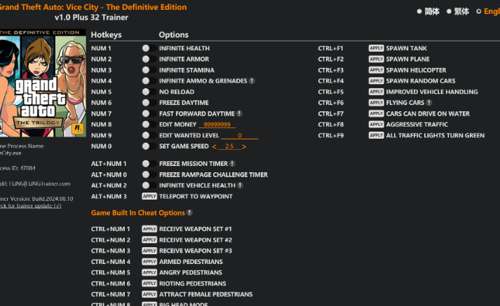 replyreload += ',' + 2354959; 32 選項 · 遊戲版本:v1.0 · 最後更新:2024.08.10 俠盜獵車手:罪惡都市 最終版 訓練器/作弊選項 數字 1 – 無限生命值 數字鍵 2 - 無限護甲 數字鍵 3 - 無限耐力 數字鍵 4 -