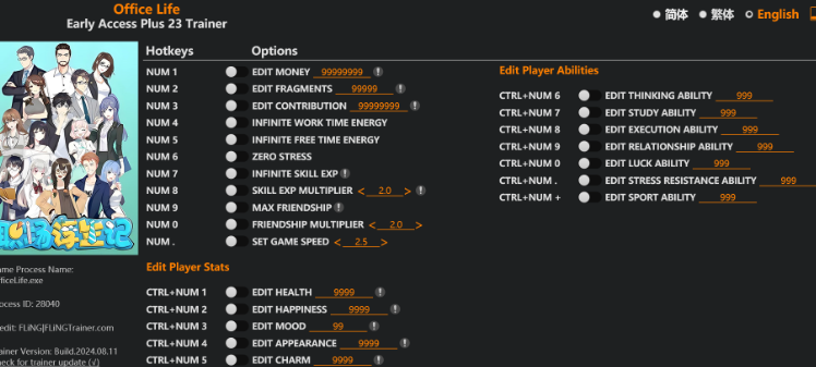 replyreload += ',' + 2354961; 23 選項 · 遊戲版本:搶先體驗+ · 最後更新:2024.08.11 辦公室生活培訓師/作弊選項 數字 1 – 編輯金錢 數字鍵 2 - 編輯片段 數字鍵 3 - 編輯貢獻 數字鍵 4 - 無限工作時間能