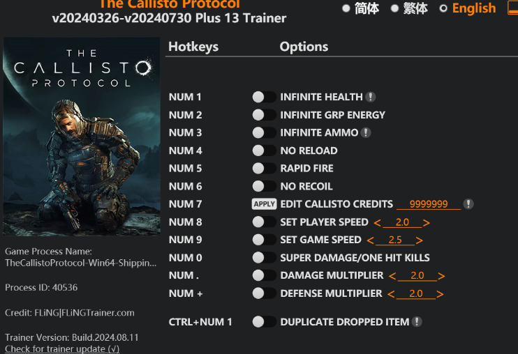 replyreload += ',' + 2354965; 13個選項·遊戲版本:v20240326-v20240730+·最後更新:2024.08.11 Callisto 協議訓練器/CheatOptions 數字 1 – 無限生命值 數字鍵 2 - 無限 GRP 能量 數字鍵 3 - 無限彈藥 數字