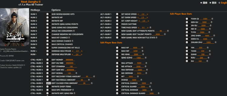 replyreload += ',' + 2354967; 60 選項 · 遊戲版本:v1.1.x+ · 最後更新:2024.08.11 下一篇 江湖 II 數字鍵 1 – 上帝模式/忽略命中 數字鍵 2 - 無限 HP 數字鍵 3 - 無限 MP 數字鍵 4 - 無限輕