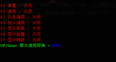 replyreload += ',' + 2355489;應某個使用者要求更新的,穩定性自測 Ins = 顯示|隱藏菜單 F1 = 準星 F2 = 開啟透視 F3 = 隊友透視 F4 = 敵人透視 F5 = 顯示距離 F6 = 顯示血量 F7 = 顯示射線 ↑ = 上調最大透視