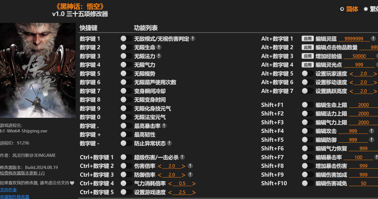 replyreload += ',' + 2355637; 選項 數字鍵 1 – 上帝模式/忽略命中 數字鍵 2 – 無限生命值 數字鍵 3 - 無限法力 數字鍵 4 - 無限耐力 數字鍵 5 - 無限專注 數字鍵 6 - 無限使用葫蘆 數字鍵 7 - 瞬間變身冷卻