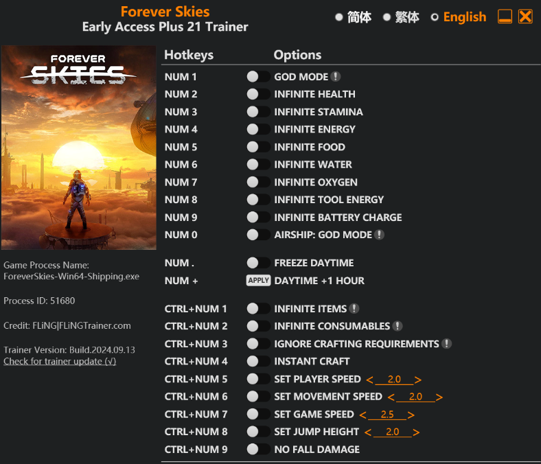 正文摘要:replyreload += ',' + 2358568; 《氧氣計劃》Forever Skies 免費修改器下載教學 超強外掛無限資源 ☑️ 《氧氣計劃》Forever Skies 遊戲介紹 《氧氣計劃》(Forever Skies)是一款極具挑戰性的生存冒險遊戲。玩家將在一個被毀滅的地球上,駕駛高科技飛船探索充滿危險的天空。本次我們為大家帶來了這款遊戲的最新修改器,讓您在末日世界中暢遊無阻! ☑️ 修改器功能一覽 這款《氧氣計劃》修改器提供了多達21種強大功能,讓您在遊戲中無往不利: 1. 無敵模式(Num 1) 2. 無限生命值(Num 2) 3. 無限耐力(Num 3) 4. 無限能量(Num 4) 5. 無限食物(Num 5) 6. 無限水(Num 6) 7. 無限氧氣(Num 7) 8. 無限工具能量(Num 8) 9. 無限電池電量(Num 9) 10. 飛船無敵模式(Num 0) 11. 凍結時間(Num .) 12. 時間+1小時(Num +) 13. 無限物品(Ctrl+Num 1) 14. 無限消耗品(Ctrl+Num 2) 15. 忽略製作需求(Ctrl+Num 3) 16. 即時製作(Ctrl+Num 4) 17. 設定玩家速度(Ctrl+Num 5) 18. 設定移動速度(Ctrl+Num 6) 19. 設定遊戲速度(Ctrl+Num 7) 20. 無限跳躍(Ctrl+Num 8) 21. 設定跳躍高度(Ctrl+Num 9) 22. 無摔落傷害(Ctrl+Num 0) ☑️ 修改器使用教學 1. 下載修改器檔案 2. 解壓縮下載的檔案 3. 執行修改器程式 4. 啟動《氧氣計劃》遊戲 5. 在遊戲中使用對應的按鍵組合啟動所需功能 ☑️ 注意事項 - 本修改器適用於 Early Access 版本,最後更新日期為2024年9月13日 - 使用修改器可能會影響遊戲平衡,請謹慎使用 - 建議在單人模式中使用,避免影響其他玩家的遊戲體驗 ☑️ 下載連結 所有站內附件皆會附上安全掃描報告請會員查看純淨度百分比後判斷使用(adsbygoogle = window.adsbygoogle || []).push({});相關檔案須知:取得檔案前,請先詳細閱讀文章內容避免不必要錯誤與誤會發生。也可多參考文章討論樓層內容了解附件檔案相關討論資訊。 【此文章部分內容隱藏中】 解除隱藏說明教學點擊下方 繼續閱讀文章 後請仔細觀看文章內容 並依照指示進行下一步最後完成解除隱藏後系統會回到此文章自動顯示隱藏內容~繼續閱讀 ☑️ 常見問題 Q&A Q1: 使用修改器會被封號嗎? A1: 本修改器主要設計用於單人遊戲模式。在多人模式中使用可能會導致帳號被封禁,請謹慎使用。 Q2: 修改器無法正常運作怎麼辦? A2: 請確保您的遊戲版本與修改器版本相符。如果問題仍然存在,可以嘗試以系統管理員身份執行修改器。 Q3: 使用修改器會影響遊戲存檔嗎? A3: 一般來說不會直接影響存檔,但建議在使用修改器前先備份您的遊戲存檔,以防萬一。 Q4: 修改器的快捷鍵可以自訂嗎? A4: 本版本的修改器暫不支援自訂快捷鍵,需要使用預設的按鍵組合。 Q5: 遊戲更新後修改器還能用嗎? A5: 遊戲大幅更新後,修改器可能需要相應更新才能正常使用。請關注最新版本的修改器。 👉 GM後台版 遊戲 推薦 ⬇️⬇️⬇️ 快速玩各種二次元動漫手遊appreplyreload += ',' + 2358568; |