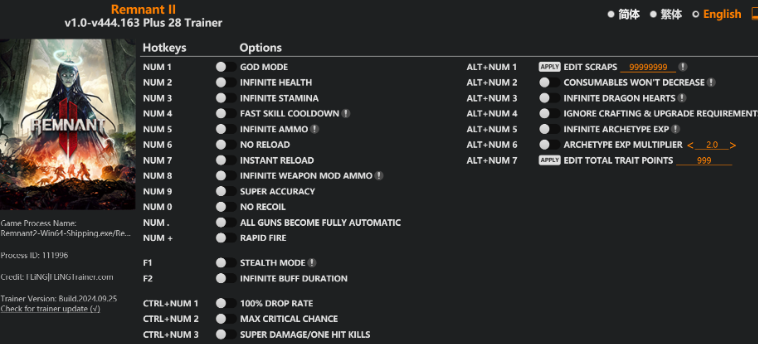 正文摘要:replyreload += ',' + 2359591;《遺跡2》最新免費修改器下載與使用教學 ☑️ 遺跡2修改器介紹 遺跡2(Remnant II)是一款備受期待的動作射擊遊戲,現在有了這個功能強大的修改器,玩家們可以體驗更多樣化的遊戲樂趣。本修改器提供28種選項,涵蓋了遊戲中的各個方面,從無敵模式到資源修改,應有盡有。 ☑️ 修改器功能一覽 1. 無敵模式 (Num 1) 2. 無限生命值 (Num 2) 3. 無限耐力 (Num 3) 4. 技能快速冷卻 (Num 4) 5. 無限彈藥 (Num 5) 6. 無需裝彈 (Num 6) 7. 即時裝彈 (Num 7) 8. 無限武器模組彈藥 (Num 8) 9. 超級準確度 (Num 9) 10. 無後座力 (Num 0) 11. 所有槍支全自動化 (Num .) 12. 快速射擊 (Num +) 13. 隱形模式 (F1) 14. 無限增益效果持續時間 (F2) 15. 100%掉落率 (Ctrl+Num 1) 16. 最大暴擊機率 (Ctrl+Num 2) 17. 超級傷害/一擊必殺 (Ctrl+Num 3) 18. 傷害倍數調整 (Ctrl+Num 4) 19. 設定玩家速度 (Ctrl+Num 5) 20. 設定移動速度 (Ctrl+Num 6) 21. 設定遊戲速度 (Ctrl+Num 7) 22. 編輯碎片數量 (Alt+Num 1) 23. 消耗品不減少 (Alt+Num 2) 24. 無限龍心 (Alt+Num 3) 25. 忽略製作與升級需求 (Alt+Num 4) 26. 無限原型經驗 (Alt+Num 5) 27. 原型經驗倍數調整 (Alt+Num 6) 28. 編輯總特質點數 (Alt+Num 7) ☑️ 修改器使用方法 1. 下載修改器檔案 2. 解壓縮下載的檔案 3. 執行遊戲 4. 運行修改器程式 5. 在遊戲中使用對應的快捷鍵啟動所需功能 ☑️ 注意事項 - 本修改器支援遊戲版本 v1.0-v444.163+ - 使用修改器可能會影響遊戲平衡,建議僅在單人模式中使用 - 定期檢查修改器更新,以確保與最新遊戲版本相容 ☑️ 下載連結 所有站內附件皆會附上安全掃描報告請會員查看純淨度百分比後判斷使用(adsbygoogle = window.adsbygoogle || []).push({});相關檔案須知:取得檔案前,請先詳細閱讀文章內容避免不必要錯誤與誤會發生。也可多參考文章討論樓層內容了解附件檔案相關討論資訊。 【此文章部分內容隱藏中】 解除隱藏說明教學點擊下方 繼續閱讀文章 後請仔細觀看文章內容 並依照指示進行下一步最後完成解除隱藏後系統會回到此文章自動顯示隱藏內容~繼續閱讀 檔案名稱: Remnant.II.v1.0-v444.163.Plus.28.Trainer-FLiNG.zip ☑️ 常見問題與解答 Q1: 使用修改器會影響我的遊戲存檔嗎? A1: 一般來說不會直接影響存檔,但建議在使用修改器前先備份存檔以策安全。 Q2: 修改器可以在多人遊戲中使用嗎? A2: 不建議在多人遊戲中使用修改器,這可能會影響其他玩家的遊戲體驗,甚至導致帳號被封禁。 Q3: 如果遊戲更新了,修改器還能使用嗎? A3: 修改器可能需要更新以支援最新的遊戲版本。請定期檢查修改器的更新情況。 Q4: 使用修改器會讓遊戲變得無聊嗎? A4: 這取決於個人喜好。有些玩家喜歡挑戰,有些則喜歡輕鬆遊玩。建議根據自己的喜好適度使用修改器功能。 👉 GM後台版 遊戲 推薦 ⬇️⬇️⬇️ 快速玩各種二次元動漫手遊appreplyreload += ',' + 2359591; |