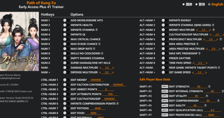 各位俠士們,今天為大家帶來一款強大的《刀劍江湖路》修改器,讓你在這片江湖中如魚得水!這款修改器包含多達41種功能,適用於Early Access+版本,最後更新時間為2024年9月26日。無論你是想成為無敵大俠,還是想快速累積財富,這款修改器都能滿足你的需求。