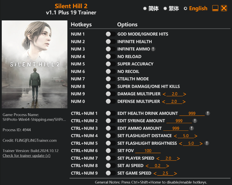 各位恐怖遊戲愛好者們好!今天要為大家介紹的是《沉默之丘2》(Silent Hill 2)的最新版修改器。這款修改器包含了19種強大的功能選項,可以讓您的遊戲體驗更加豐富多彩。無論您是想要輕鬆探索遊戲世界,還是想要挑戰更高難度的gameplay,這款修改器都能滿足您的需求。