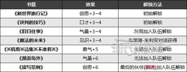 正文摘要:▶ 《暗喻幻想:ReFantazio》全書籍收集攻略與新手開局心得 在《暗喻幻想:ReFantazio》這款遊戲中,書籍收集是一個重要的遊戲機制,不僅能夠豐富遊戲體驗,還能提升角色的各項屬性。本攻略將為大家詳細介紹如何收集全部書籍,以及一些容易被忽略的細節。 ▶ 《暗喻幻想:ReFantazio》書籍收集概述 在遊戲中,大多數書籍都是隨著支持者的加入而解鎖的。玩家可以在鐵甲戰車上閱讀這些書籍,每次閱讀都能增加相對應的五維屬性。值得注意的是,每本書都可以閱讀三次,因此最大化利用每本書的價值是很重要的。 👉 GM後台版 遊戲 推薦 ⬇️⬇️⬇️ 快速玩各種二次元動漫手遊app ▶ 《暗喻幻想:ReFantazio》書籍閱讀方法 閱讀書籍的方法非常簡單: 1. 在使用鐵甲戰車移動期間 2. 與車內的書架互動 3. 選擇想要閱讀的書籍 注意事項:強烈建議玩家一旦解鎖布萊港區域,就立即前往獲取這本書。因為如果推進到下一個區域,朱利安就會離開這個位置,之後將無法獲得這本重要的書籍。 ▶ 《暗喻幻想:ReFantazio》書籍收集對比表 書籍類型獲取方式閱讀次數屬性提升一般書籍支持者加入時解鎖3次對應五維屬性《魔法的未來》特定NPC對話獲得3次對應五維屬性 以下廣告滑動後還有帖子內容var custom_call_MIR = function (params) {if ( params === null || params.hasAd === false ) {var divRowSide;for (let index = 0; index < ONEADs.length; index++) {if (ONEADs[index].pub.player_mode === "mobile-inread") {divRowSide = ONEADs[index].pub.slotobj;}}var ins = document.createElement('ins');ins.className = 'clickforceads';ins.setAttribute('style', 'display:inline-block;');ins.setAttribute('data-ad-zone', '18264');divRowSide.appendChild(ins);var js = document.createElement('script');js.async = true;js.type = 'text/javascript';js.setAttribute('src', '//cdn.holmesmind.com/js/init.js');js.onload = function(){console.log('[ONEAD MIR] ClickForce Loaded');};divRowSide.appendChild(js);}};var _ONEAD = {};_ONEAD.pub = {};_ONEAD.pub.slotobj = document.getElementById("oneadMIRDFPTag");_ONEAD.pub.slots = ["div-onead-ad"];_ONEAD.pub.uid = "1000509";_ONEAD.pub.external_url = "https://onead.onevision.com.tw/";_ONEAD.pub.scopes = ["spotbuy", "speed"];_ONEAD.pub.player_mode_div = "div-onead-ad";_ONEAD.pub.player_mode = "mobile-inread";_ONEAD.pub.queryAdCallback = custom_call_MIR;var ONEAD_pubs = ONEAD_pubs || [];ONEAD_pubs.push(_ONEAD);var truvidScript = document.createElement('script'); truvidScript.async = true; truvidScript.setAttribute('data-cfasync','false'); truvidScript.type = 'text/javascript'; truvidScript.src = '//stg.truvidplayer.com/index.php?sub_user_id=597&widget_id=3309&playlist_id=2381&m=a&cb=' + (Math.random() * 10000000000000000); var currentScript = document.currentScript || document.scripts[document.scripts.length - 1]; currentScript.parentNode.insertBefore(truvidScript, currentScript.nextSibling); ▶ 《暗喻幻想:ReFantazio》書籍收集常見問題Q&A Q1: 每本書可以閱讀幾次? A1: 每本書都可以閱讀3次,每次閱讀都會提升相應的屬性。 Q2: 如何閱讀書籍? A2: 在鐵甲戰車移動時,與車內的書架互動即可閱讀書籍。 Q3: 《魔法的未來》這本書在哪裡獲得? A3: 在海洋都市布萊港的漁夫旅店廣場,與NPC朱利安對話獲得。 Q4: 如果錯過了《魔法的未來》,還有機會獲得嗎? A4: 一旦離開布萊港區域,朱利安就會消失,將無法再獲得這本書,所以務必及時獲取。 Q5: 閱讀書籍能提升哪些屬性? A5: 閱讀書籍可以提升遊戲中的五維屬性,具體提升哪個屬性取決於所閱讀的書籍內容。 |