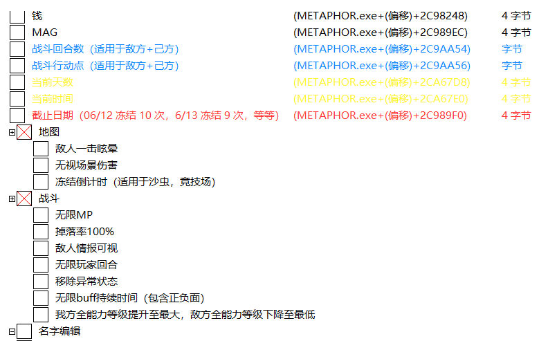 正文摘要:replyreload += ',' + 2362083; ☑️ 《暗喻幻想:ReFantazio》 ☑️ [修改] 《暗喻幻想:ReFantazio》10月20日版本 PC/XBOX 全功能免費修改器下載教學 各位玩家好!今天要為大家介紹《暗喻幻想:ReFantazio》的最新修改器。這個修改器適用於學習版、PC正版和XBOX版,功能相當強大,而且全面支援中文介面。不僅可以修改基礎屬性、道具和技能,還新增了許多實用的功能。讓我們一起來看看吧! Cheat Engine (CE修改器) 7.5 漢化版 中文版 https://www.game735.com/thread-377613-1-1.html 3. 查看CT修改選單中相應的數據欄地址 例如:金錢地址為「METAPHOR.exe+(偏移)+2C98248」 4. 使用十六進位計算偏移 計算方式:2C8A9A8 - 2C98248 = -D8A0(以學習版為例) ☑️ 下載連結: 各版本的修改器除了偏移的預設值不同,其他功能都是一樣的喔! 所有站內附件皆會附上安全掃描報告請會員查看純淨度百分比後判斷使用(adsbygoogle = window.adsbygoogle || []).push({});相關檔案須知:取得檔案前,請先詳細閱讀文章內容避免不必要錯誤與誤會發生。也可多參考文章討論樓層內容了解附件檔案相關討論資訊。 【此文章部分內容隱藏中】 解除隱藏說明教學點擊下方 繼續閱讀文章 後請仔細觀看文章內容 並依照指示進行下一步最後完成解除隱藏後系統會回到此文章自動顯示隱藏內容~繼續閱讀 ☑️ 常見問題 Q&A: Q1: 這個修改器安全嗎?會影響我的遊戲存檔嗎? A1: 本修改器經過多次測試,相當安全。不過,建議在使用前先備份您的遊戲存檔,以確保萬無一失。 Q2: 我該如何安裝這個修改器? A2: 下載後解壓縮文件,然後運行主程式即可。使用時請確保遊戲已經啟動。 Q3: 修改器支援哪些語言? A3: 本修改器完全支援繁體中文介面,操作相當友善。 Q4: 如果遊戲更新了,我該怎麼調整修改器? A4: 只需按照上述教學,計算新的偏移值並在修改器中更新即可。這樣就能適應新版本的遊戲了。 Q5: 使用修改器會影響遊戲體驗嗎? A5: 這取決於個人喜好。有些玩家喜歡挑戰原版難度,有些則喜歡輕鬆體驗劇情。建議根據自己的需求適度使用修改器功能。 希望這篇教學能幫助您順利使用《暗喻幻想:ReFantazio》的修改器。祝遊戲愉快! 👉 GM後台版 遊戲 推薦 ⬇️⬇️⬇️ 快速玩各種二次元動漫手遊appreplyreload += ',' + 2362083; |
