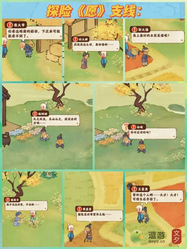 願劇情探險怎麼通關1、物資准備:紅糖x2,木材x好多,雞蛋x3,豆腐x2,面粉x2,雞蛋面x2,糯米糕X2,雞肉x1,酸菜x1,白菜x3,青竹x2,燒餅x1,竹簍x1,士豆餅x12、支線任務:8個(圖片中為人物解鎖順序)