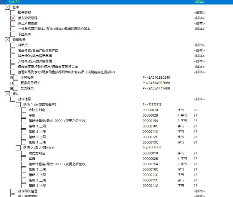正文摘要:replyreload += ',' + 2362750; 《三國志8重製版》CE修改器更新v14版本 完整修改功能教學 ☑️ 修改器更新重點 最新版本的三國志8重製版修改器已推出v14版本更新,本次更新重點包含人物相關功能強化與介面優化,讓玩家能更便利地進行各項修改。 ☑️ 最新功能說明 • 優化人物資料讀取功能,支援自動讀取太守、名品持有者、金蘭等特殊身份人物 • 新增自訂武將修改功能,可自由設定特殊語音(如:使用呂布語音等) • 支援名品價值與能力加成批量修改 • 新增官階、功績批量修改功能 ☑️ 完整功能列表 1. 基礎功能 - 一鍵儲存功能 - 常用修改腳本快速啟動 2. 全局修改 - 劇本開始時間調整 - 當前遊戲時間修改 3. 主角相關 - 行動力數值修改 - 金錢數量調整 - 友好信物修改 4. 人物能力 - 五維數值與經驗值修改 - 特技戰法設定 - 名聲與功績調整 5. 名品系統 - 名品種類更改 - 價值與效果修改 - 能力加成設定 - 特技與持有者指定 6. 城池管理 - 城市物資數量 - 士兵數量調整 - 發展度修改 7. 勢力相關 - 勢力技能設定 - 技能書調整 - 外交友好度修改 8. 戰鬥系統 - 部隊兵力調整 - 部隊位置修改 - 戰意數值設定 - 策略條參數調整 9. 特殊功能 - 單挑系統修改 - 舌戰系統調整 - 無限次數設定 - 各項數值倍率修改 Cheat Engine (CE修改器) 7.5 漢化版 中文版 https://www.game735.com/thread-377613-1-1.html ☑️ 常見問題Q&A Q1: 修改器是否支援最新版本遊戲? A1: 是的,本修改器已更新至v14版本,完全支援最新版本的三國志8重製版。 Q2: 修改後的存檔會不會造成遊戲損毀? A2: 建議在修改前先備份存檔,以確保遊戲資料安全。 Q3: 如何正確使用特殊語音修改功能? A3: 在自訂武將頁面中,可以從特殊語音列表中選擇想要套用的語音。 ☑️ 下載連結 所有站內附件皆會附上安全掃描報告請會員查看純淨度百分比後判斷使用(adsbygoogle = window.adsbygoogle || []).push({});相關檔案須知:取得檔案前,請先詳細閱讀文章內容避免不必要錯誤與誤會發生。也可多參考文章討論樓層內容了解附件檔案相關討論資訊。 【此文章部分內容隱藏中】 解除隱藏說明教學點擊下方 繼續閱讀文章 後請仔細觀看文章內容 並依照指示進行下一步最後完成解除隱藏後系統會回到此文章自動顯示隱藏內容~繼續閱讀 👉 GM後台版 遊戲 推薦 ⬇️⬇️⬇️ 快速玩各種二次元動漫手遊appreplyreload += ',' + 2362750; |