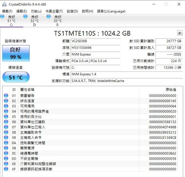 正文摘要:replyreload += ',' + 2363519;《硬碟檢測》CrystalDiskInfo 9.4.4 免費中文版下載|最新硬碟健康診斷工具 ☑️ 軟體資訊 【軟體名稱】:CrystalDiskInfo 9.4.4 繁體中文版 【軟體類型】:硬碟檢測與健康監控工具 【版本資訊】:9.4.4(安裝版/免安裝版) 【支援語系】:繁體中文/多國語言 【檔案大小】:安裝版 5.64 MB / 免安裝版 7.29 MB 【相容系統】:Windows 7/8/10/11 【更新日期】:2024/11/06 ☑️ 軟體特色 1. 完整支援SMART硬碟監控技術 2. 即時顯示硬碟溫度與健康狀態 3. 支援各大廠牌HDD與SSD硬碟 4. 提供詳細的硬碟進階資訊檢視 5. 介面清爽直觀,適合新手使用 ☑️ 軟體介紹 CrystalDiskInfo(簡稱:CDI)是一款專業的硬碟健康檢測工具,能夠即時監控硬碟的運作狀態。本軟體支援: - 一般硬碟(HDD) - 固態硬碟(SSD):Intel、Samsung、Indilinx等品牌 - 外接式USB硬碟 - NVMe固態硬碟 ▲ 詳細的硬碟資訊檢視介面 ☑️ 下載連結 所有站內附件皆會附上安全掃描報告請會員查看純淨度百分比後判斷使用(adsbygoogle = window.adsbygoogle || []).push({});相關檔案須知:取得檔案前,請先詳細閱讀文章內容避免不必要錯誤與誤會發生。也可多參考文章討論樓層內容了解附件檔案相關討論資訊。 【此文章部分內容隱藏中】 解除隱藏說明教學點擊下方 繼續閱讀文章 後請仔細觀看文章內容 並依照指示進行下一步最後完成解除隱藏後系統會回到此文章自動顯示隱藏內容~繼續閱讀 ☑️ 常見問題Q&A Q1:為什麼需要使用CrystalDiskInfo? A1:定期檢測硬碟健康狀態可以預防資料遺失,及早發現潛在問題。 Q2:軟體顯示的硬碟狀態顏色代表什麼? A2:藍色代表良好、黃色代表注意、紅色代表警告,建議立即備份資料。 Q3:免安裝版與安裝版有什麼區別? A3:功能完全相同,免安裝版方便攜帶,安裝版則會整合到系統中。 👉 GM後台版 遊戲 推薦 ⬇️⬇️⬇️ 快速玩各種二次元動漫手遊appreplyreload += ',' + 2363519; |